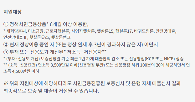 | 대출 자격요건 | 일정 소득이 있는 저신용자도 가능 |