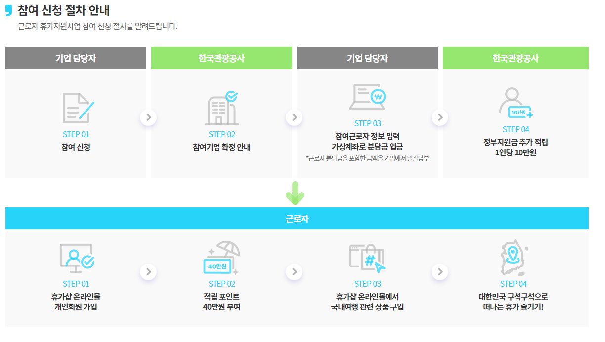 근로자 20만 + 회사 10만 + 정부 10만 = 40만원으로 휴가샵에서 사용가능합니다!